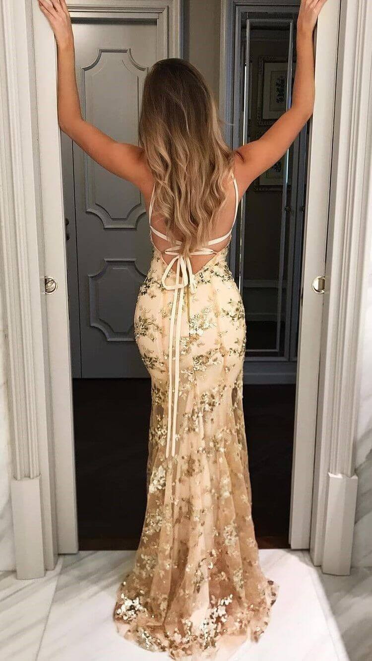 Den har åpen rygg, spaghettistropper og en utringning som passer perfekt. Supplert med et langt, flytende skjørt, vil denne kjolen få frem din indre prinsesse på ballen!