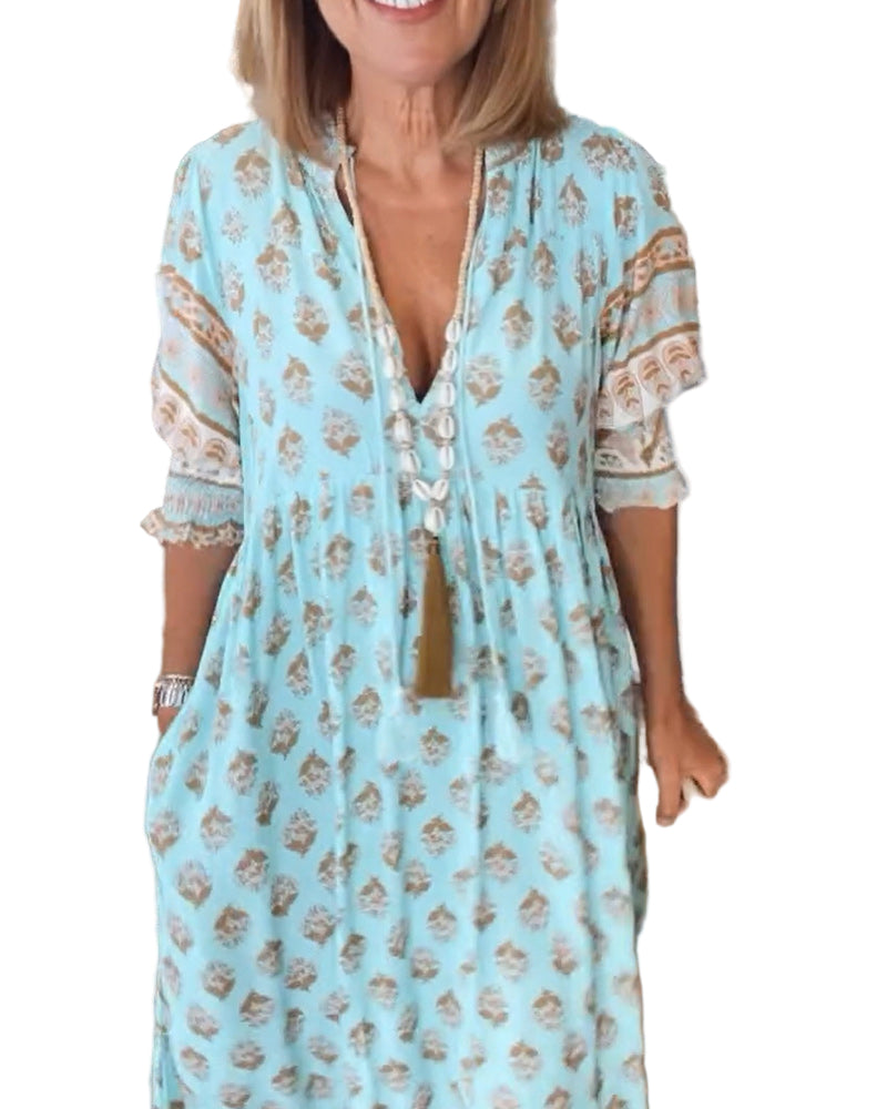 Opplev vårens eleganse med denne A-linje kjolen for kvinner, som har en flatterende V-hals og myke lanterneslirer. Den lette konstruksjonen gir komfort hele dagen, mens den flytende A-linje silhuetten fremhever din naturlige form.
